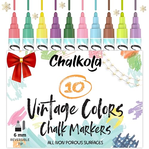 Chalkola flytande kritpennor för svarta tavlan, whiteboard, fönster, etiketter, glas, bräda – 10 vintage färger, torkbar färg, tvättbart bläck, 6 mm vändbar kula