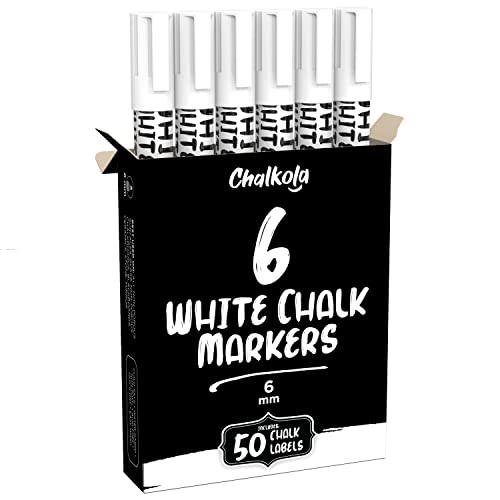 Chalkola Flytande kritpennor - vita torra suddbara kritmarkörer för svarta tavlan, fönster, tavla, glas - 6 mm vändbar spets (6-pack 50 svarta tavlan-etiketter ingår
