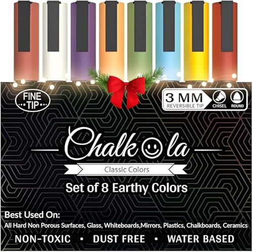 Fin spets svarta tavlan kritpennor – paket med 8 klassiska jordfärger | Giftfria våta sudda vätskekrita bläckmarkörer | 3 mm vändbar kul- och mejselspets