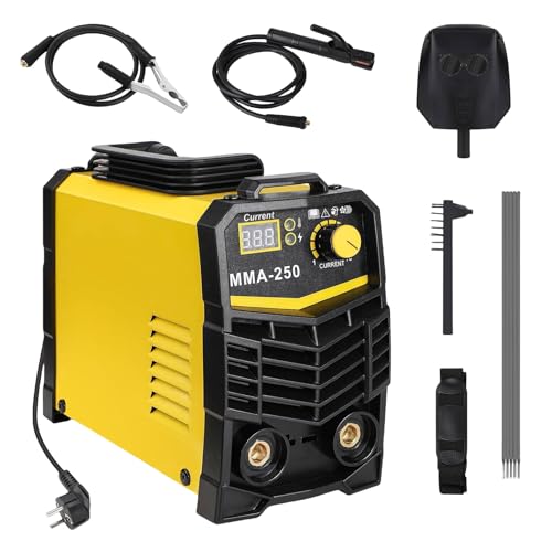MMA elektrodsvetsmaskin, 250 A, svetsmaskin, IGBT-växelriktare, minilektroder, svetsmaskin, justerbar effekt, LED-display, ARC-svetsmaskin, anti-stick med svetsklämma (gul)