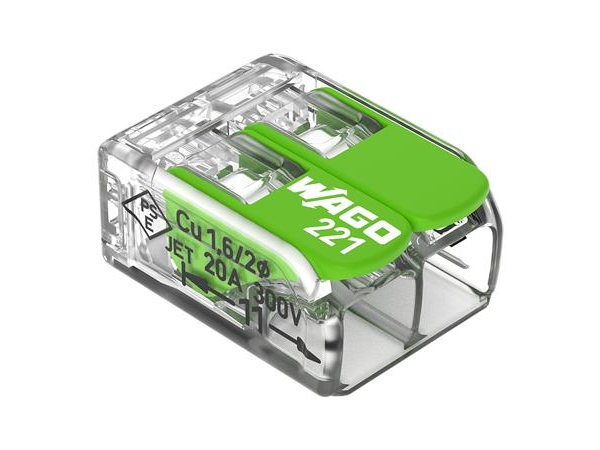 Wago 221 Grön 2-Vägs Svetsklämma, Tvärsnitt 0,2-4Mm2, 32A, 450V, Med Manöverhandtag, Transparent - (100 St.)