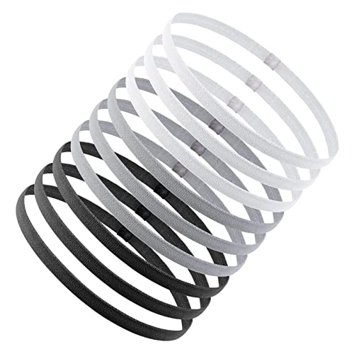 URAQT elastiska halkfria sport hårband, 9 st halkfria silikongrepp sport hårband, elastiska tunna sport pannband Svettband pannband för kvinnor män tennis basket fotboll running cykel yoga(svart/vit/grå)