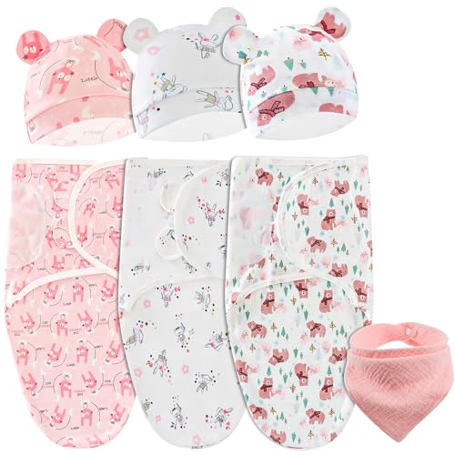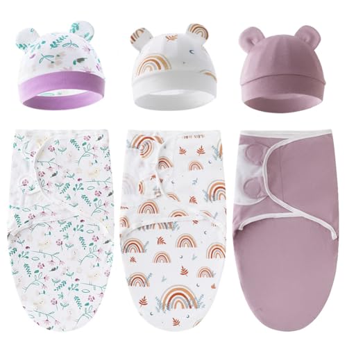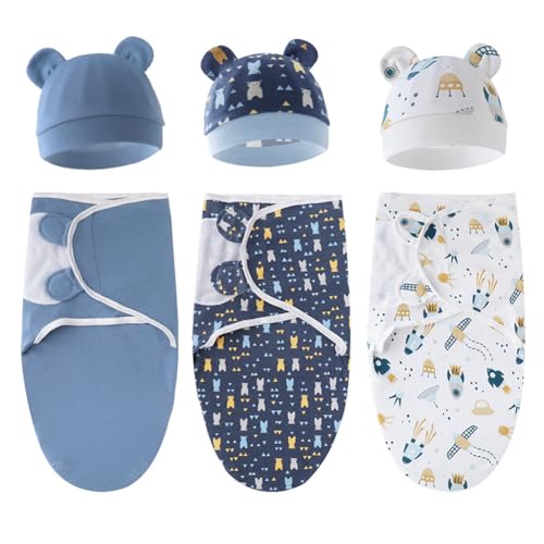 WuGU 3-pack swaddle filt 0-3 månader, baby sovsäck med mössa, spädbarn sovsäck wrap, 100% andningsbar bomull, baby pojke flicka, justerbar linda för spädbarn 73 x 50 cm (med salivduk)