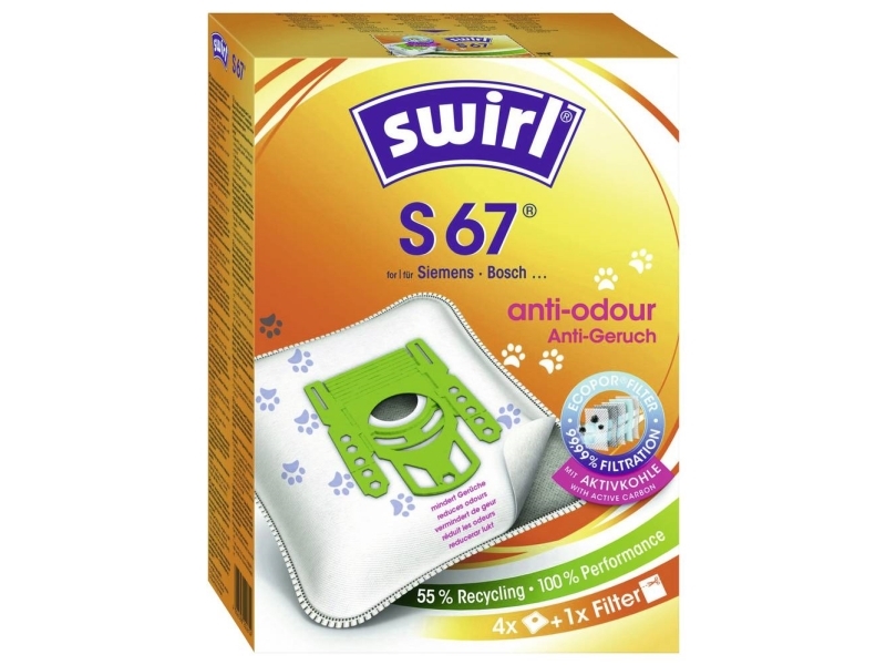 Siemens VSZ3XTRM11 Dammsugare, Svart, Grå, 4 l & Swirl S 67 MicroPor Plus Dammsugarpåsar, för Siemens och Bosch Dammsugare, Orange/Vit, Förpackning med 4 påsar + 1 antiallergenfilter