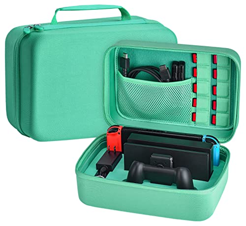 NS Switch / Switch OLED väska – Younik Deluxe hårt bländande fodral för NS Switch docka, strömförsörjning, HDMI-kabel, Pro kontrollör och 10 game cart (grön)