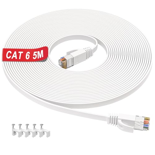 Ethernetkabel 5m, Cat 6 Internetkabel 5m Hög Hastighet, Platt Vit RJ45 Nätverkskabel 250MHz 1000Mbps, Gigabit Lång UTP LAN-kabel Utomhus Inomhus Patchkabel för Router Switch Modem PC (5 Clips)