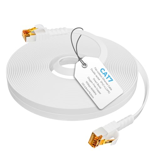 Mygatti 30 meter Cat7 platt vit Ethernet-kabel, utomhus med vattentät direktbegravning, 10 Gbps höghastighetsinternetkabel 600 Mhz, POE, för router, switch, modem, med 25 kabelklämmor