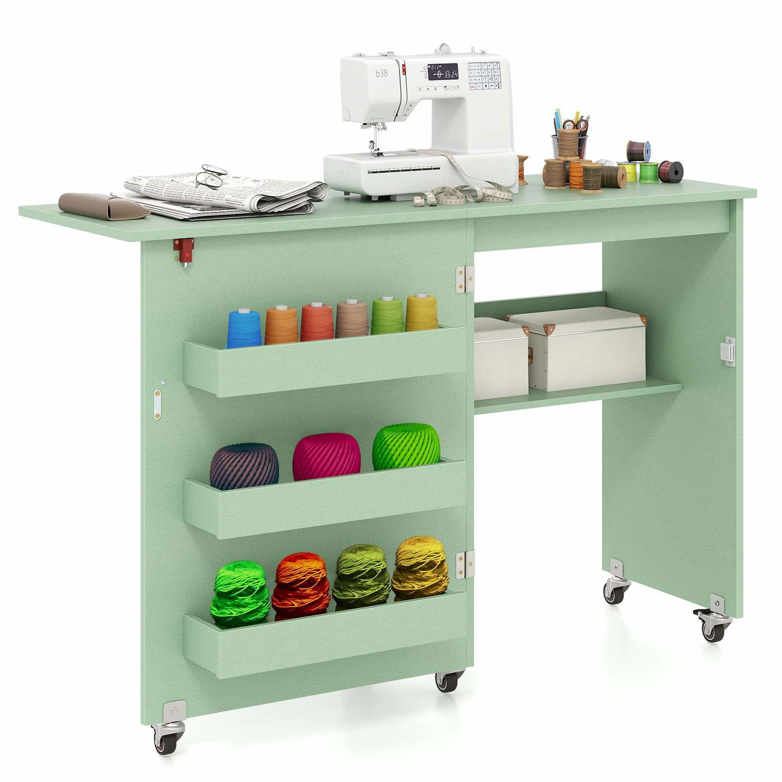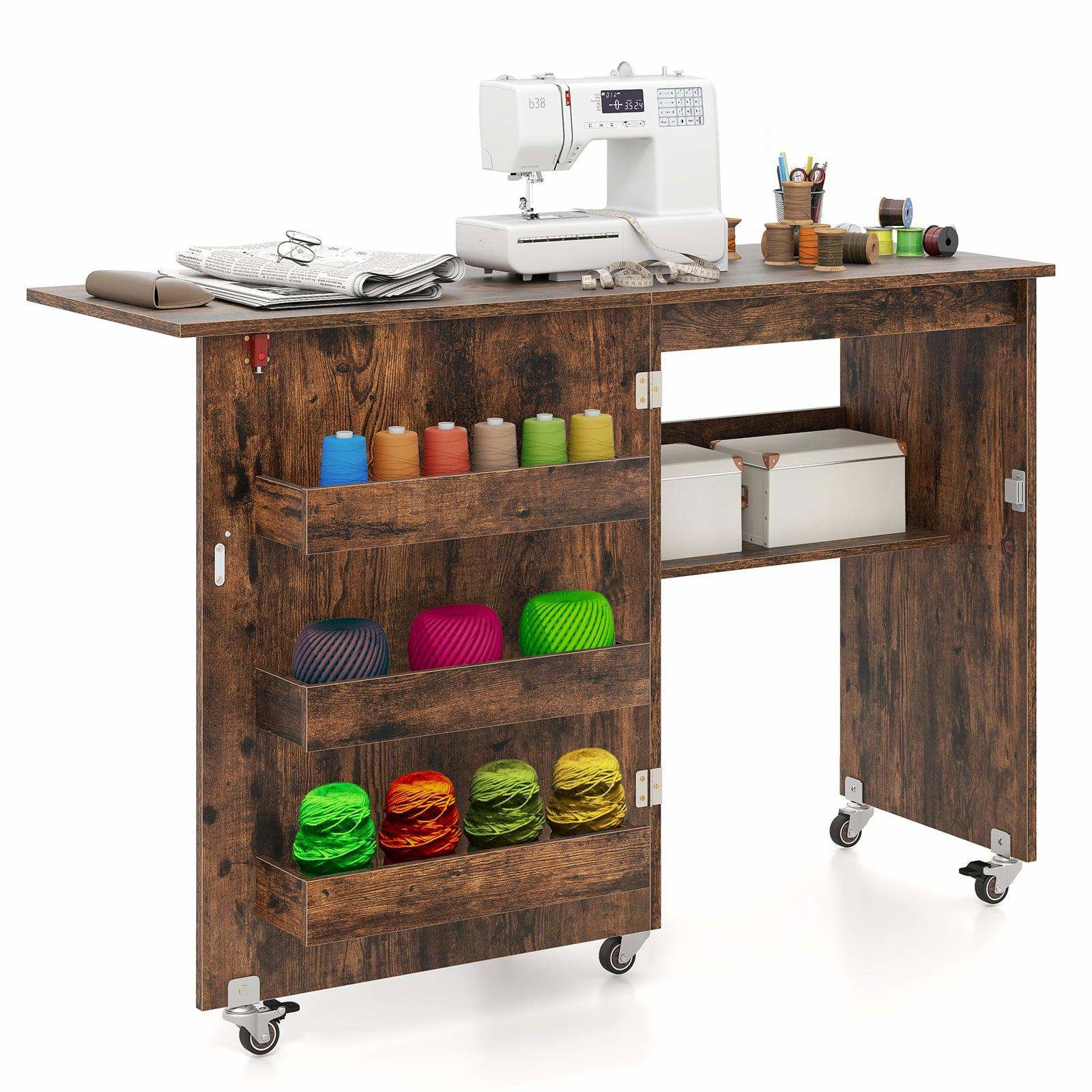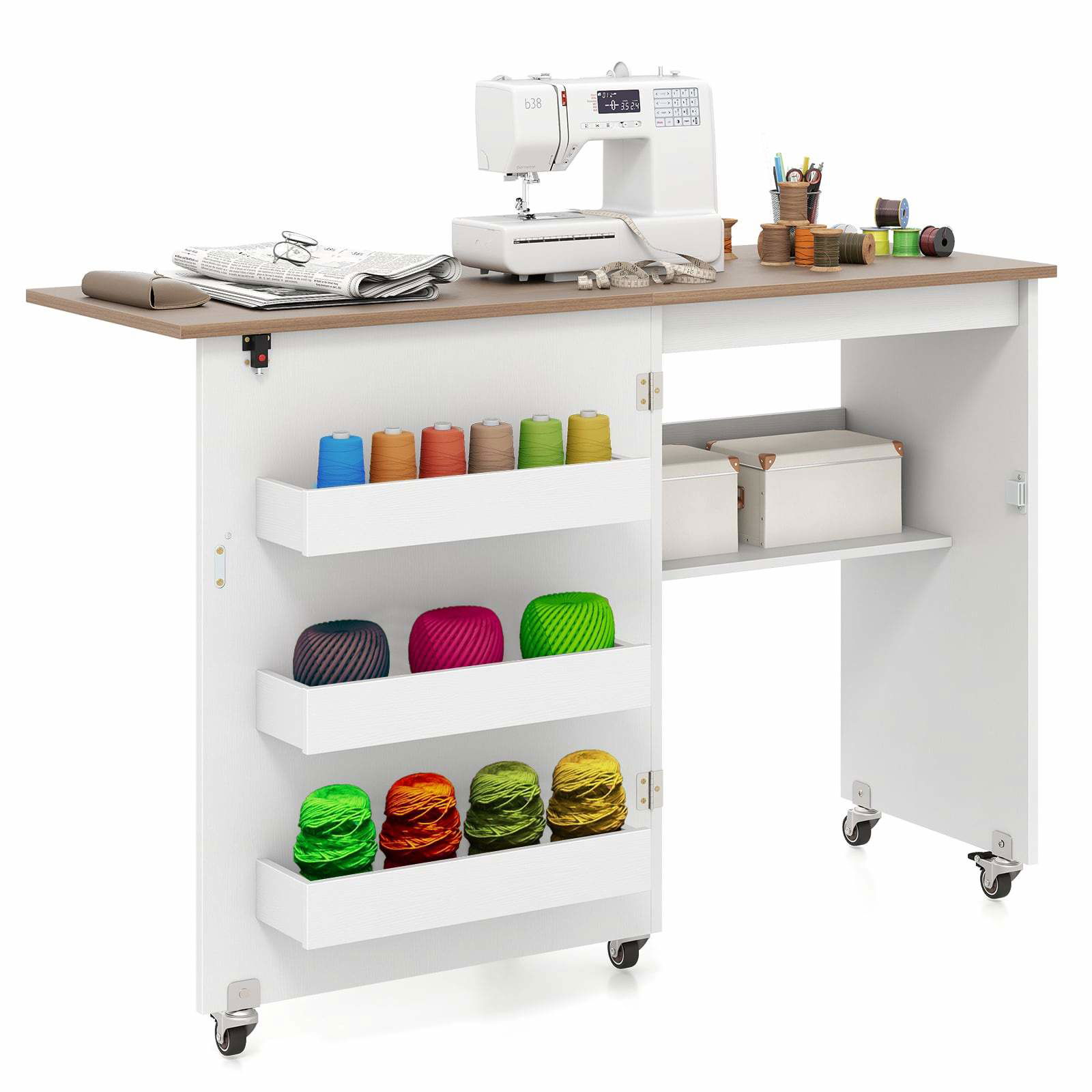 COSTWAY Symaskinbord, Fällbart sybord, Hantverksbord med förvaringsställ och låsbara hjul, Symaskin för lägenhet, Arbetsbord lämplig för litet utrymme, 117 x 40 x 77cm