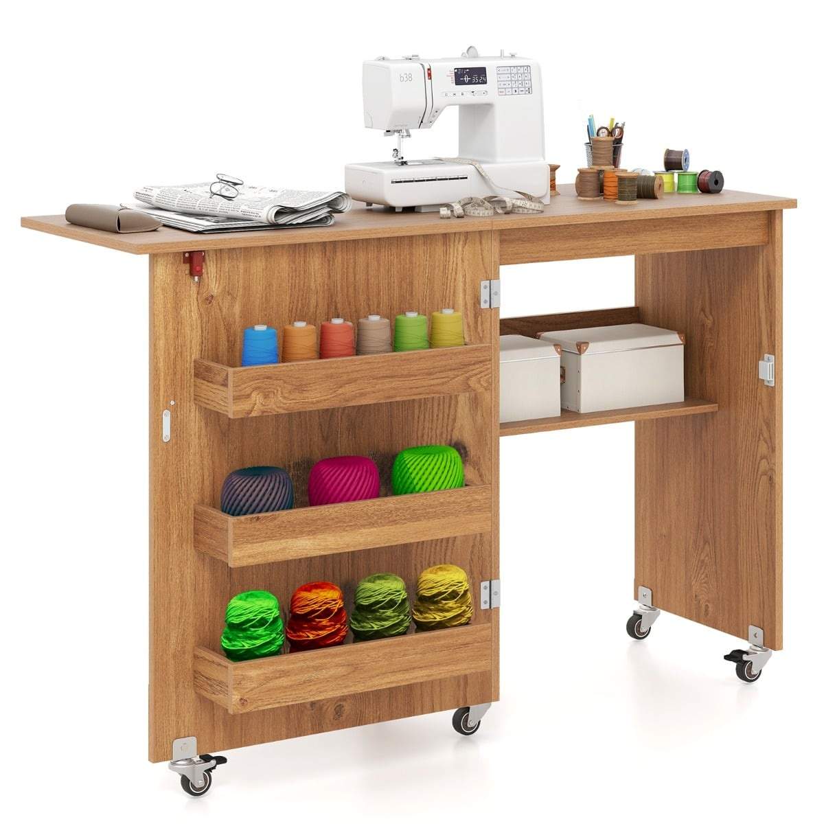 GIANTEX sömbord, hopfällbart, symaskinbord på hjul, sybord för symaskin, syskåp, trä, universalbord för vardagsrum, arbetsrum, sovrum (ek)