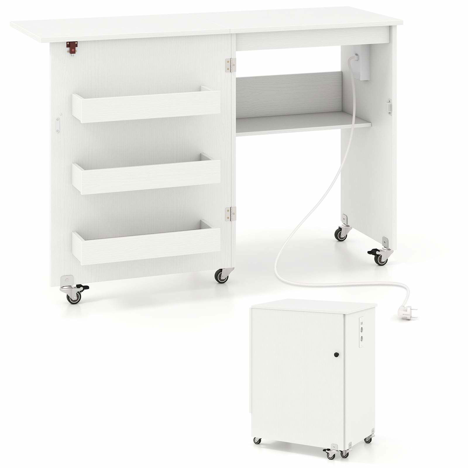 COSTWAY 2 i 1 sybord fällbart med laddningsstation, symaskinskåp av trä med hyllor, syskåp med låsbara hjul, symaskinbord, pysselbord för vardagsrum, sovrum (vit)