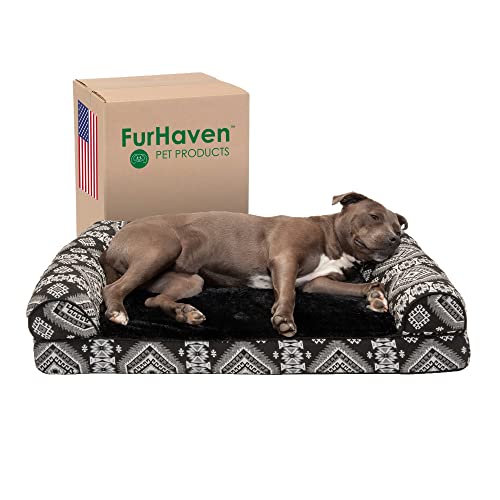 Furhaven Hundsäng för husdjur – ortopedisk plysch Kilim sydväst heminredning traditionell soffa stil vardagsrum bäddsoffa med avtagbart skydd för hundar och katter, svart medaljong, stor