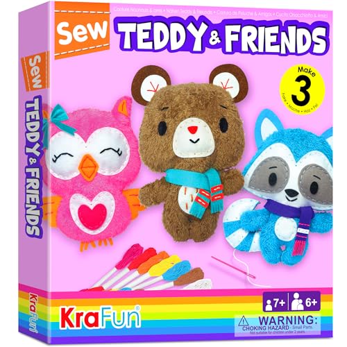 KRAFUN Sykit ålder 7+ för barn i åldrarna 7-12, nybörjarkonst & hantverksset med 3 gosedjur (teddy, tvättbjörn, uggla), plyschfiltmaterial, broderimaterial och instruktioner för att lära sig sy