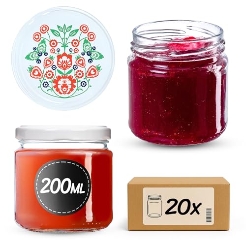 Kadax små konserveringsburkar 200 ml, syltburkar, fi66 mm, miniglas för honung och kryddor, lufttäta burkar, konserveringsglas, glas, runda glas (20 stycken, folklore)