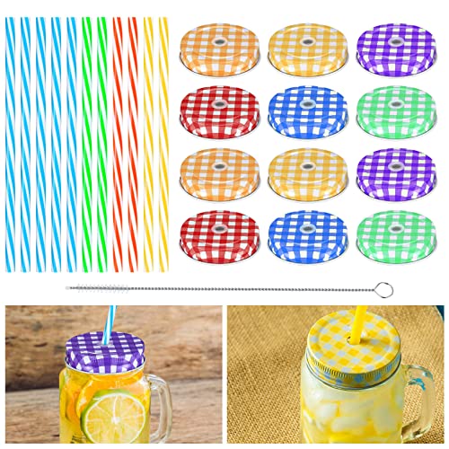 TOOINKCV 12 st. Mason-burk, skruvlock, metall för dricksglas, dryckesburkar, stängning syltburkar, lock, silikonringar, ersättningslock med 12 sugrör och sugrörsborste
