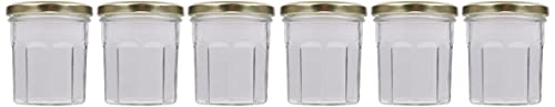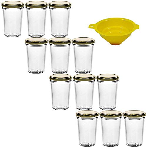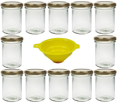Viva Haushaltswaren – 12 x syltburkar 219 ml med guldfärgad förslutning, runda fallburkar kan användas som konserveringsburkar, kryddburkar, glasburkar etc. (inklusive tratt)