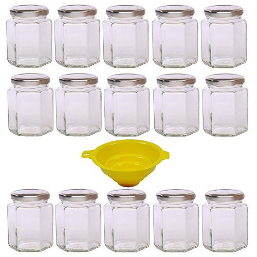 Viva Haushaltswaren - 15 x små glasburkar 196 ml med silverfärgat lock, sexkantiga glasburkar kan användas som syltburkar, kryddburkar, gästgåva etc. (inklusive tratt)