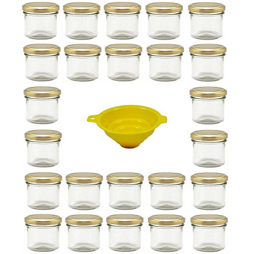 Viva Haushaltswaren - 24 x syltburkar på 125 ml med guldfärgad förslutning, runda fallburkar kan användas som konserveringsburkar, kryddburkar, glasburkar etc. (inklusive tratt)