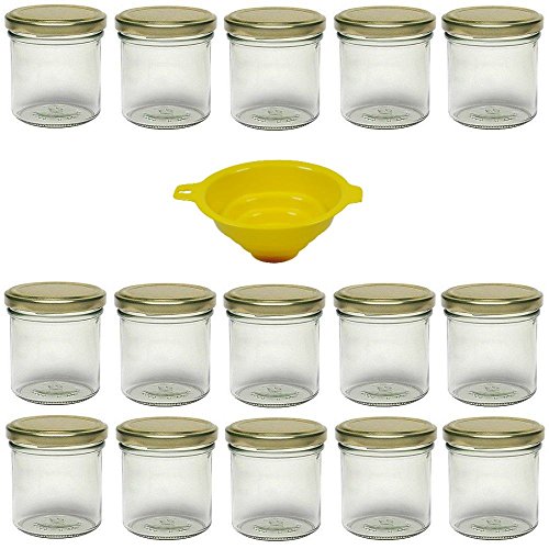 Viva Haushaltswaren – 15 x syltburkar 167 ml med guldfärgad förslutning, runda fallburkar som konserveringsburkar, kryddburkar, glasburkar etc. användbara (inklusive tratt)