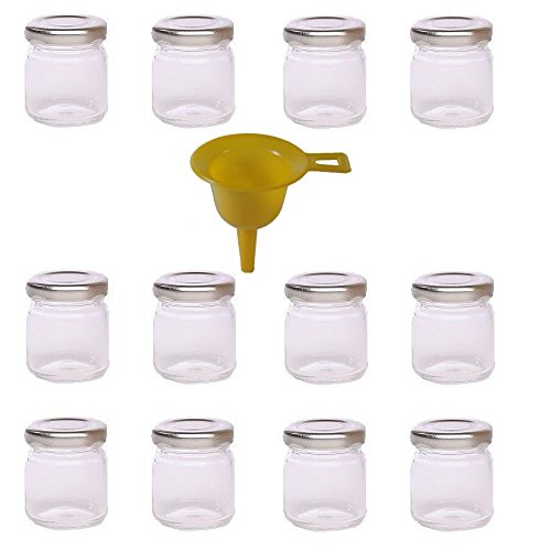 Viva Haushaltswaren - 12 x minikonserveringsburkar 53 ml med silverfärgat lock, runda glasburkar kan användas som syltburkar, kryddburkar, gästgåva etc. (inklusive tratt Ø 12,3 cm)
