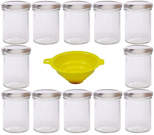 Viva Haushaltswaren – 12 x syltburkar 219 ml med silverfärgad förslutning, runda fallburkar kan användas som konserveringsburkar, kryddburkar, glasburkar etc. (inklusive tratt)