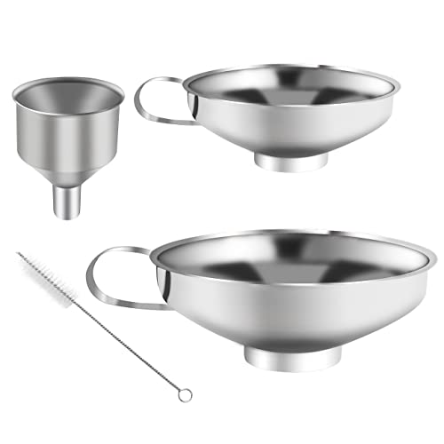 4 stycken trattar i rostfritt stål, sylttratt av rostfritt stål, påfyllningstratt med handtag, för att fylla kryddor, vätskor, pulver, bönor, syltburkar (3 storlekar, 1 borste)