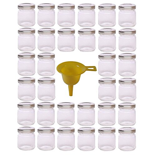 Viva Haushaltswaren – 32 x minikonserveringsburkar 53 ml med silverfärgat lock, runda glasburkar som syltburkar, kryddburkar, gästgåva etc. användbara (inklusive tratt Ø 12,3 cm)