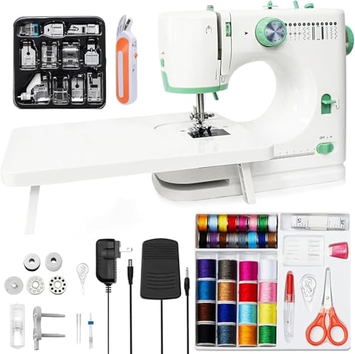 Grundläggande elektrisk symaskin för nybörjare gör-det-själv-verktyg tillbehör gåva, 12 mönster automatisk justerbar hastighet, 2 laddningsmetoder med fotstöd och tillbehör