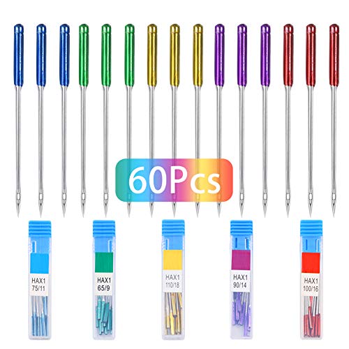 Gukasxi 60 stycken symaskinsnålar universella vanliga spetsmaskinnålar för sångare, bror, Janome, Varmax med storlek i HAX1 65/9, 75/11, 90/14, 100/16, 110/18 (5 färger)