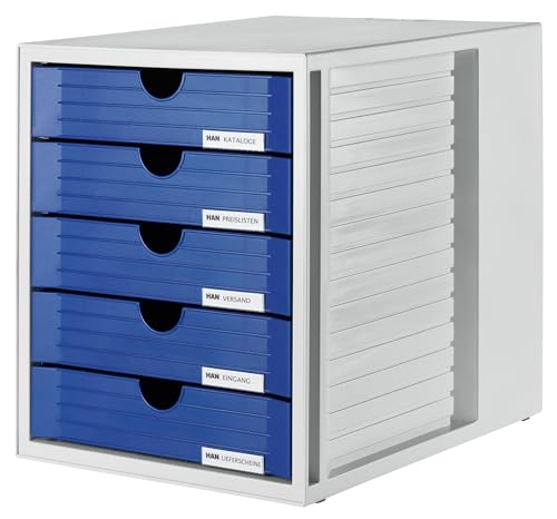 HAN Lådbox SYSTEMBOX med 5 stängda lådor för upp till DIN C4, skrivbord eller i skåp, inklusive utdragslås + märkklämma, möbelvänliga gummifötter, 1450–14, ljusgrå/blå