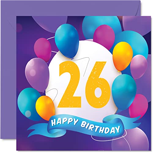 26-års födelsedagskort för män och kvinnor – ballongfest – grattis på födelsedagen-kort för 26-årig man kvinna bror syster son dotter moster farbror vän kusin, 145 mm x 145 mm födelsedag gratulationskort present