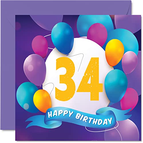 34:e födelsedagskort för män kvinnor – ballongfest – grattis på födelsedagskort för 34 år gammal man kvinna bror syster mamma pappa moster farbror bästa vän kusin, 145 mm x 145 mm födelsedag gratulationskort present