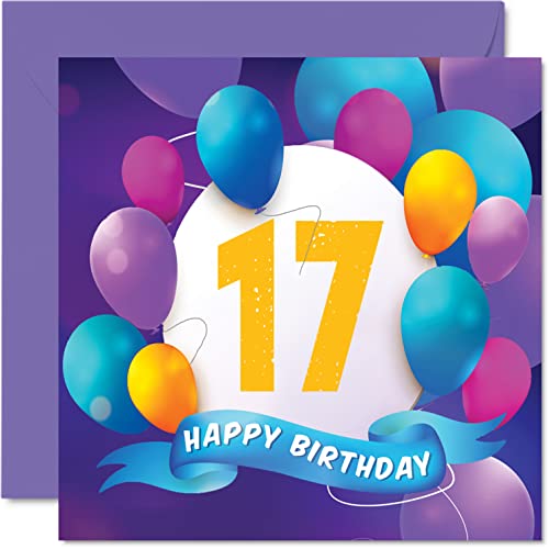 17-årskort för pojkar och flickor – ballongfest – grattis på födelsedagen-kort för 17-årig tonåring pojke flicka bror syster son dotter barnbarn, 145 mm x 145 mm födelsedag gratulationskort present