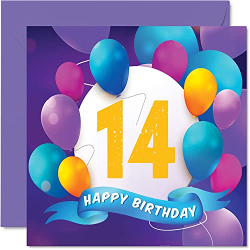 14:e födelsedagskort för pojkar flickor – ballongfest – grattis på födelsedagskort för 14 år gammal tonåring pojke flicka bror syster son dotter barnbarn, 145 mm x 145 mm födelsedag gratulationskort present