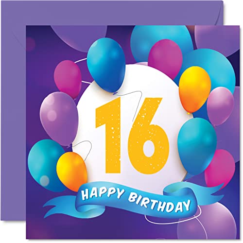 16-års födelsedagskort för pojkar och flickor – ballongfest – grattis på födelsedagen-kort för 16-årig tonåring pojke flicka bror syster son dotter barnbarn, 145 mm x 145 mm födelsedag gratulationskort present