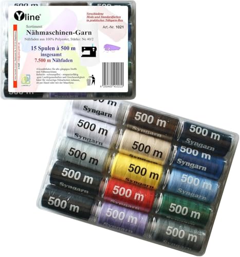 Set sytråd polyester, syngarn symaskiner – garn, färgglatt – sorterade 15 spolar a. 500 m, 1021