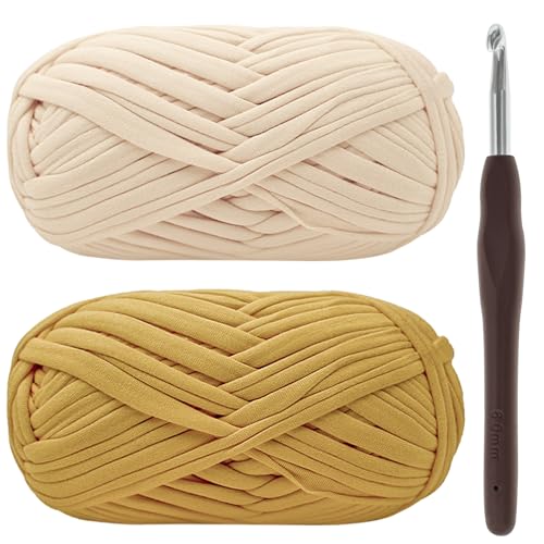 Tjockt garn för virkning, t-shirt-garn för virkning, virkning, garn, tjock ull för virkning 2 x 100 g tjockt garn med 6 mm virknål, virkgarn för nybörjare, elastisk tygduk, stickning, gult garn