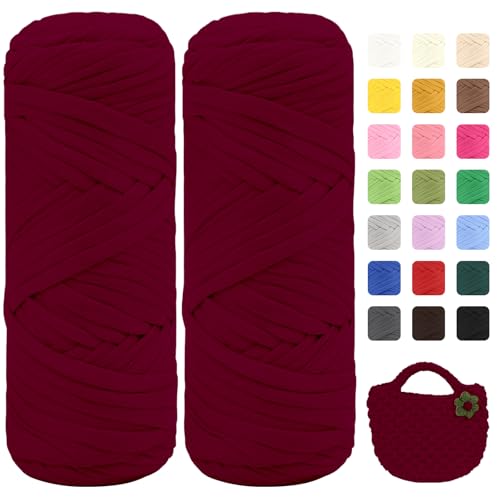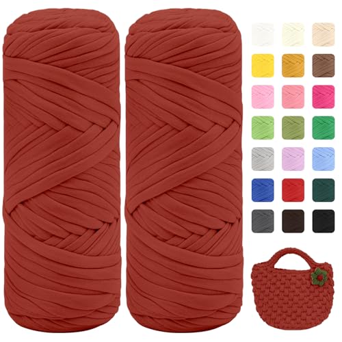 T-shirt-garn för virkning, virkgarn, tjock ull för virkning, 2 x 100 g tjockt garn med 6 mm virknål, virkat garn för nybörjare, elastiskt tygduk, stickat t-shirt-garn (röd blandning)