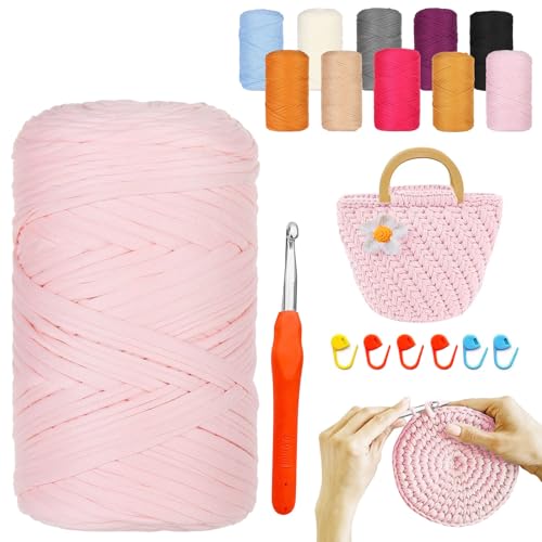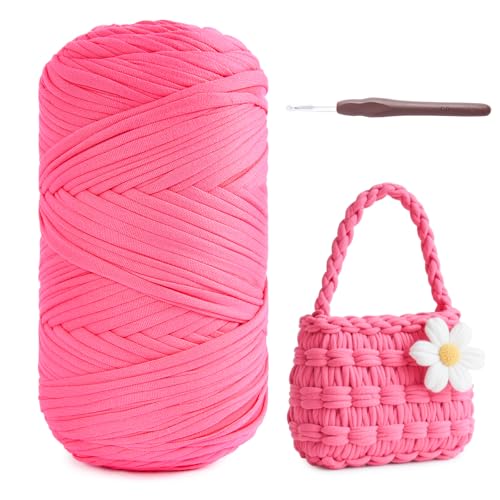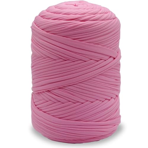 T-shirt garn 400 g/120 m, tyg t-shirt garn för virkning med 6 mm virkade nålar, tjockt polyestergarn för virkade väskor korgar mattor vävning vägg hängande heminredning gör-det-själv-hantverk (rosa)