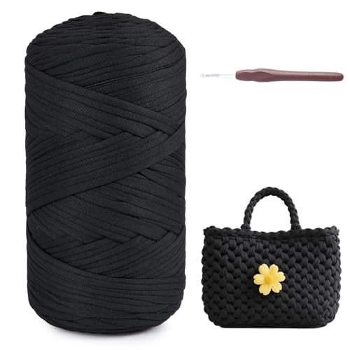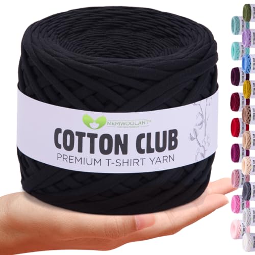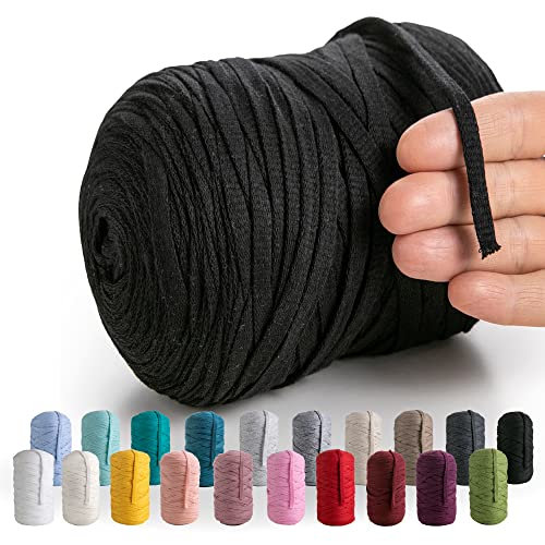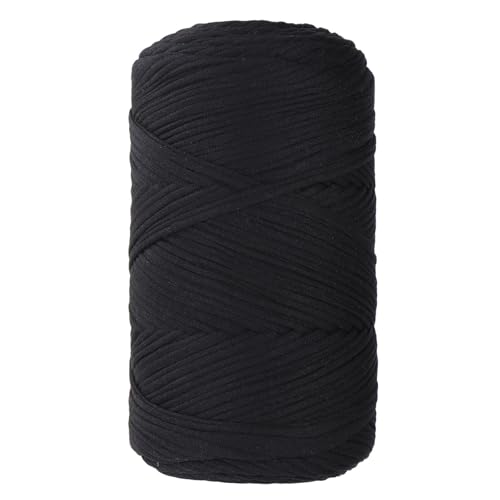 MeriWoolArt® Premium T-Shirt Garn Svart, 100% Kvalitetsbomullssnöre för Stickning, 10 mm x 110 m Textilgarn, Makramésnöre för Hantverk Virkning Fläta Vägghängning Presentinslagning Snöre