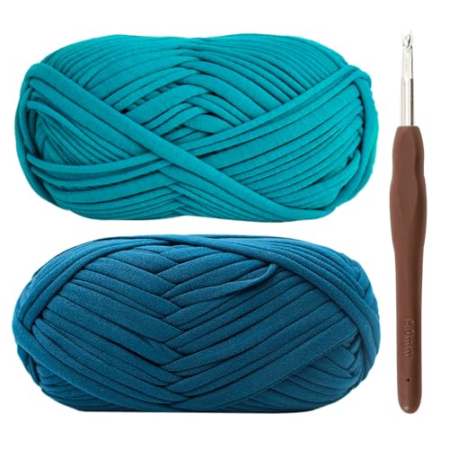T-shirt-garn för virkning 2 x 100 g tjockt virkgarn med 6 mm virknål, perfekt för virkningsprojekt – nybörjare – elastiskt tyg för gör-det-själv-hantverk (blå)