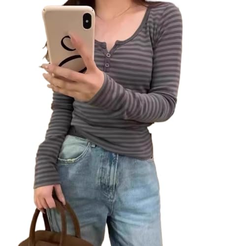 Kvinnor Y2K randiga emo-kläder fe grunge långärmade t-shirt toppar Harajuku vintage knapp t-shirts slim fit streetwear, Brun, S