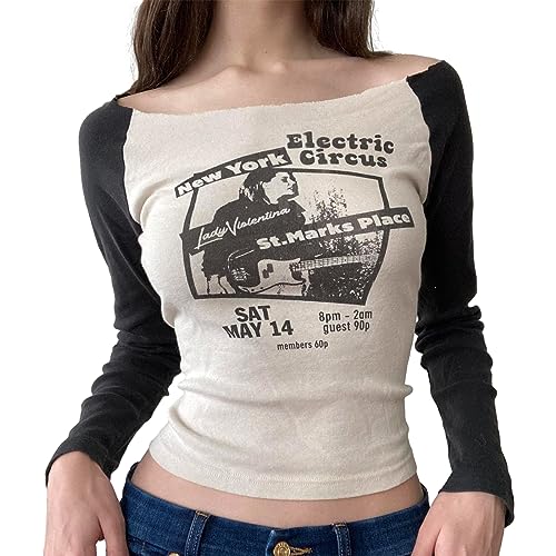 CheJooe Kvinnor Y2K långärmad topp vintage grafiskt gotiskt tryck smal passform t-shirt estetisk 90-tal älva grunge blus mode estetisk streetwear, Svart E, S