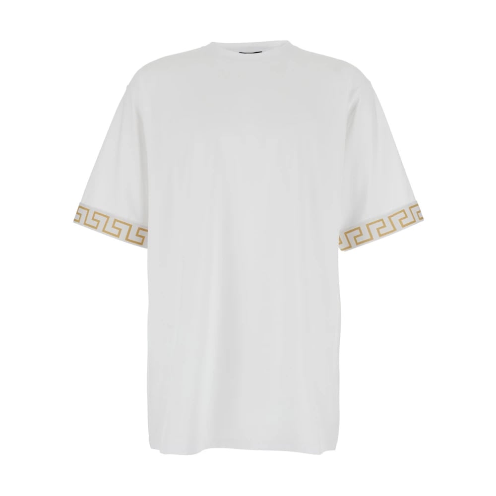 Versace, Toppar , Herr, XL, Nylon, Crewneck T-Shirt Med Greca-Mönster På Ärmarna