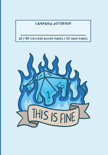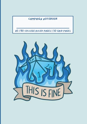 Fantasy Roleplaying Game Campaign Notebook Blue D20 Flames This Is Fine Cover A5: RPG Journal for Tabletop Adventures | 90 College Ruled Pages & 30 Grid Pages | For Players & Game Masters