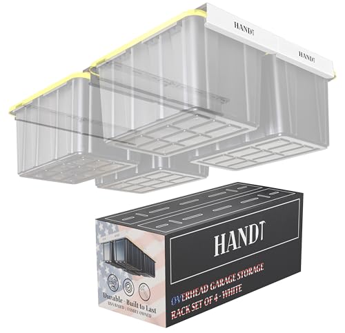 Handt overhead garage förvaringsställ, takkorg organisationsskenor hyllställ system, kraftiga hängande metallracksystem för 27 gallon behållare, stöder de flesta andra fack, 4 set vita