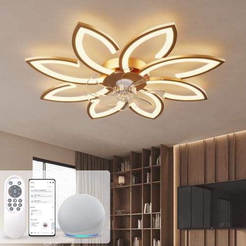 Tyst takfläkt med ljus, takfläkt med fjärrkontroll och belysning APP dimbar ljusstyrka 70W kreativ akryl blomma form taklampa med fläkt (Guld)