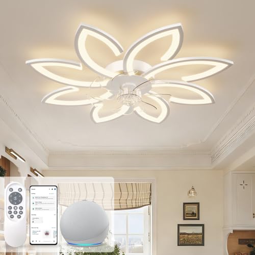 Tyst takfläkt med ljus, takfläkt med fjärrkontroll och belysning APP dimbar ljusstyrka 70W kreativ akryl blomma form taklampa med fläkt (Vit)