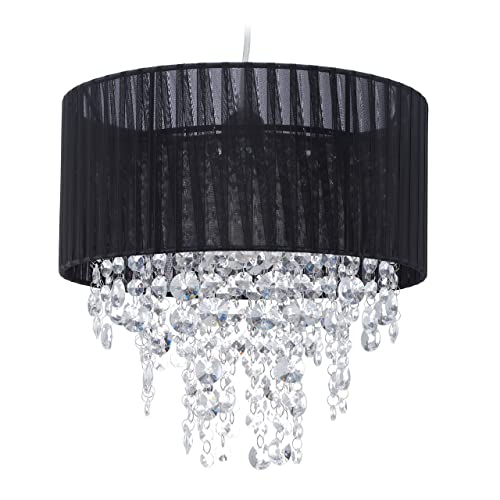 Relaxdays Pendellampa med kristall, lampskärm av organza iögonfallande taklampa, ljuskrona H x Ø: 122 x 32 cm, svart