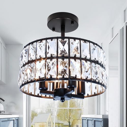 JHLBYL Modern kristalltakbelysning, 4-ljus metall svart ljuskrona taklampa, retro industriell halvspolad montering takbelysning med E14 lamphållare