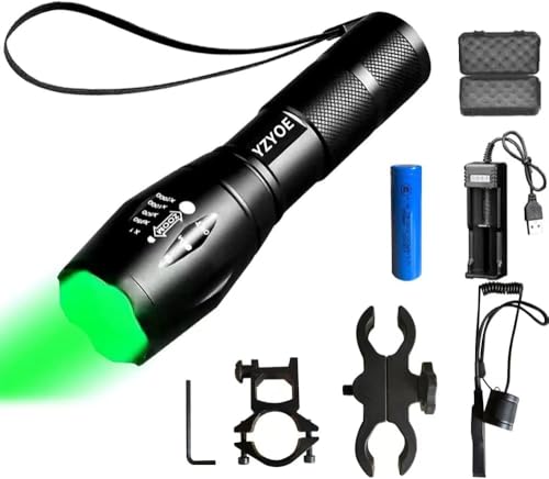 YZYOE Grönt jaktljus, uppladdningsbar taktisk ficklampa, zoombar 500 yards svinlampa Predator picatinni järnvägsmontering